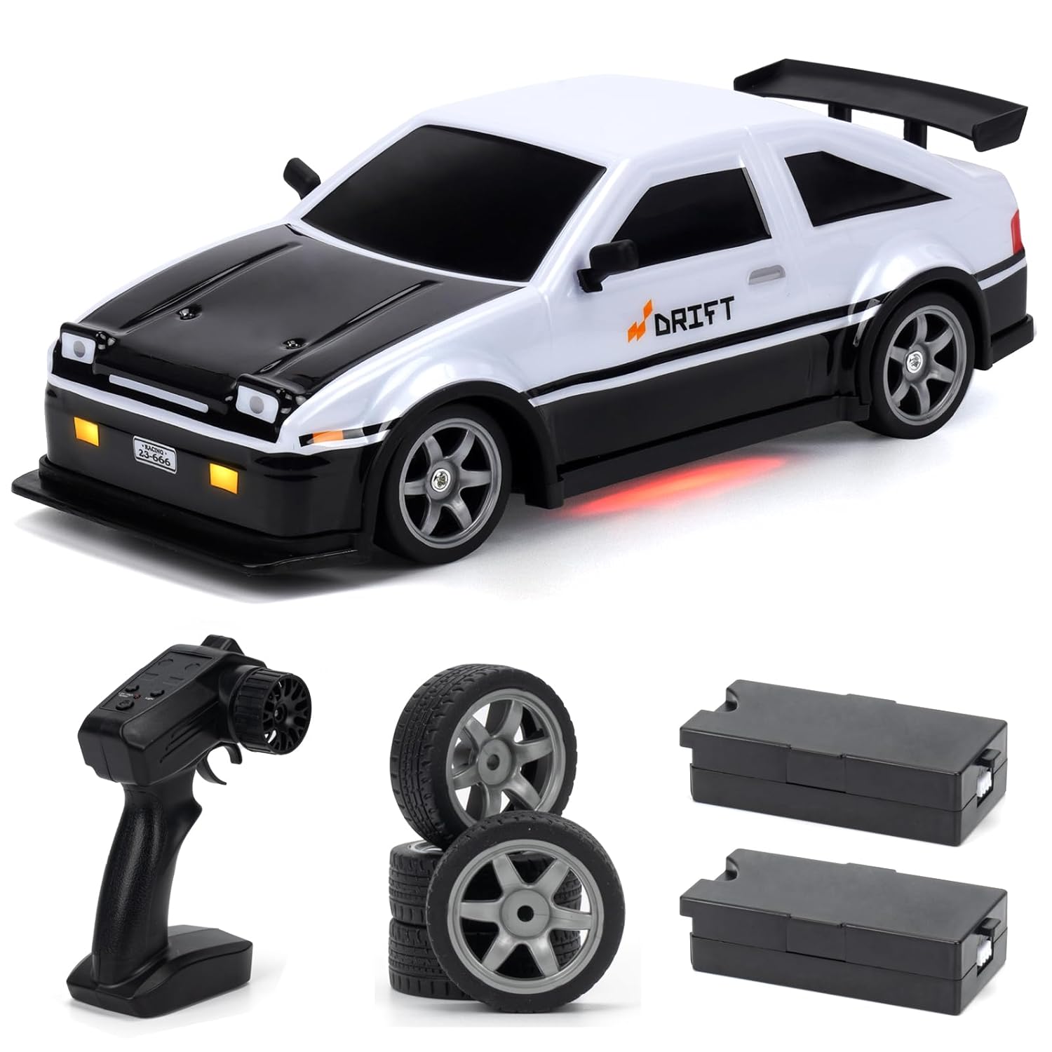 - 【LED Light and Two Kinds of Tires】Equipped with headlights, taillights and underbody lights, it looks better and can be played at night. Equipped with two kinds of car tires (one drift wheel and one normal wheel), you can choose according to different terrain.