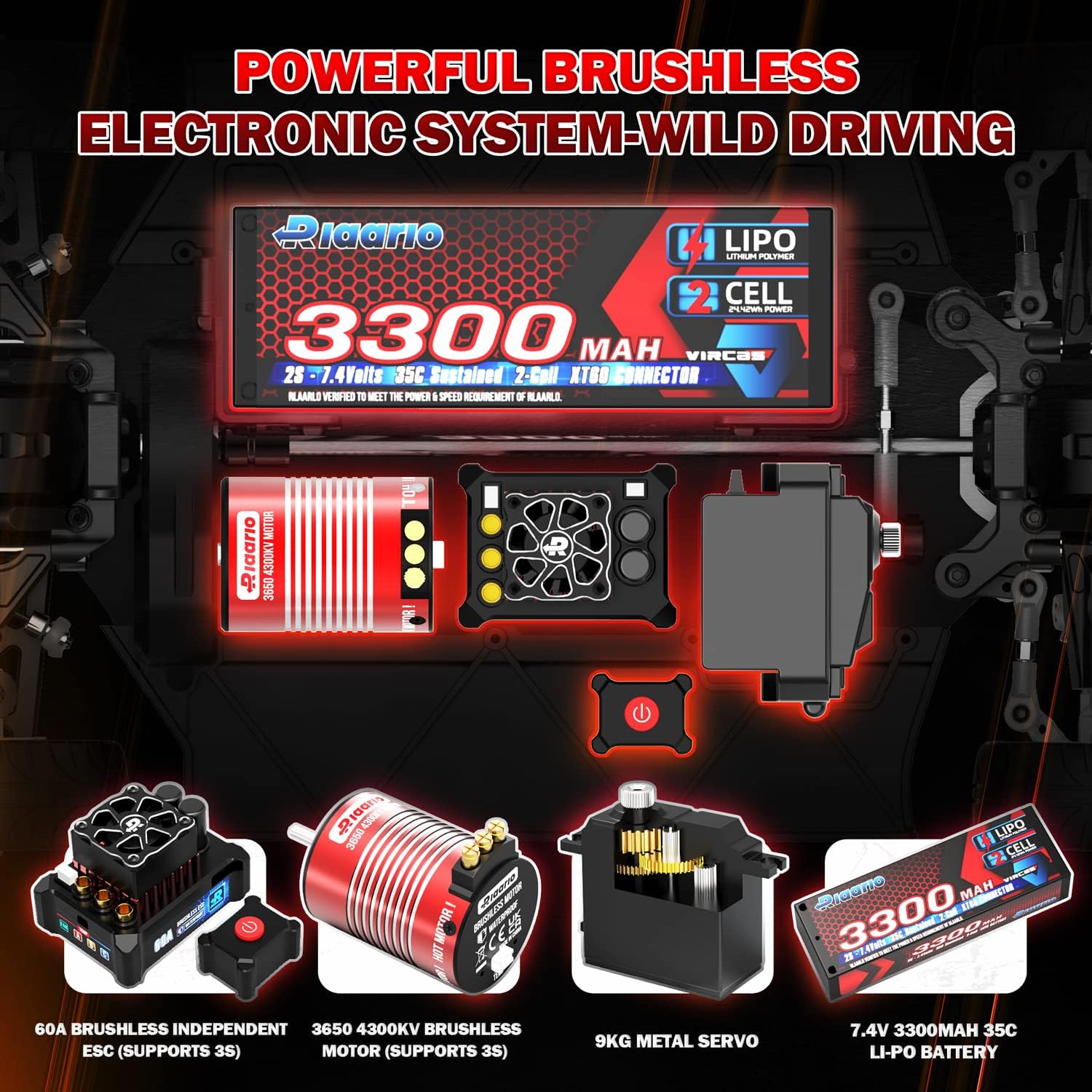 - AK-917 equips with a 9KG Metal Servo, 3650 4300KV Motor, 60A ESC, independent receiver and 1*3300 mah 2s li-po 35C battery to ensure an incredible extreme speed of this fast rc truck.