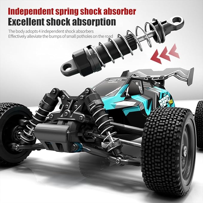 - 【High Stability】Four-wheel drive, front and rear upright spring damping, double wishbone independent suspension. Equipped with head-up wheels, simulated large foot tires, strong grip, whether it is flat, sand, mud, grass can be faced with ease.