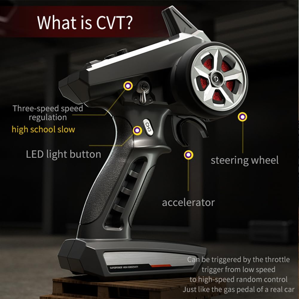- 【Full Proportional Throttle】Full proportional throttle/steering, full gear stepless speed change, equipped with LED headlights; (normal light, slow flashing, fast flashing three modes), the body is designed with simulation structure, the car shell is made of high toughness explosion-proof PVC shell, with rudder size adjustment. With the driving feel of a real car.
