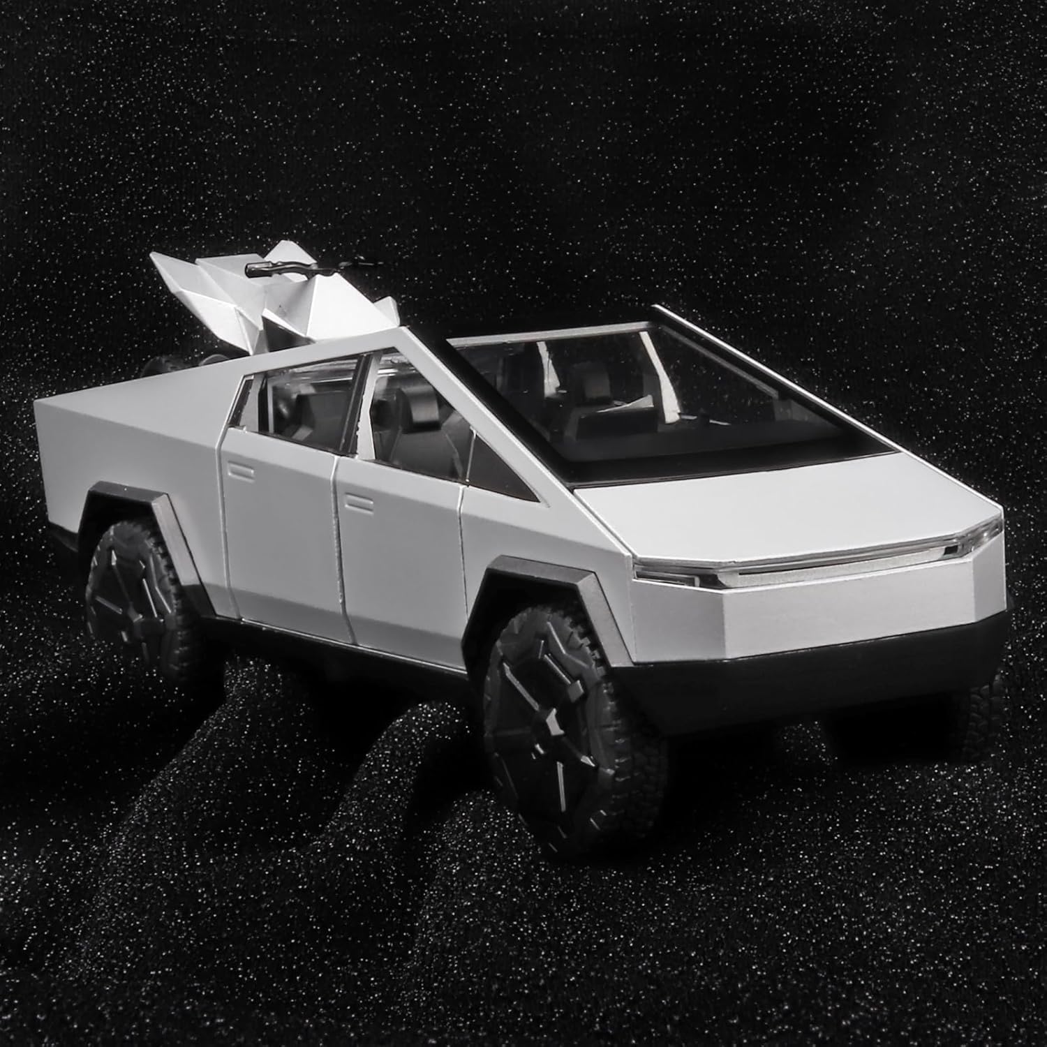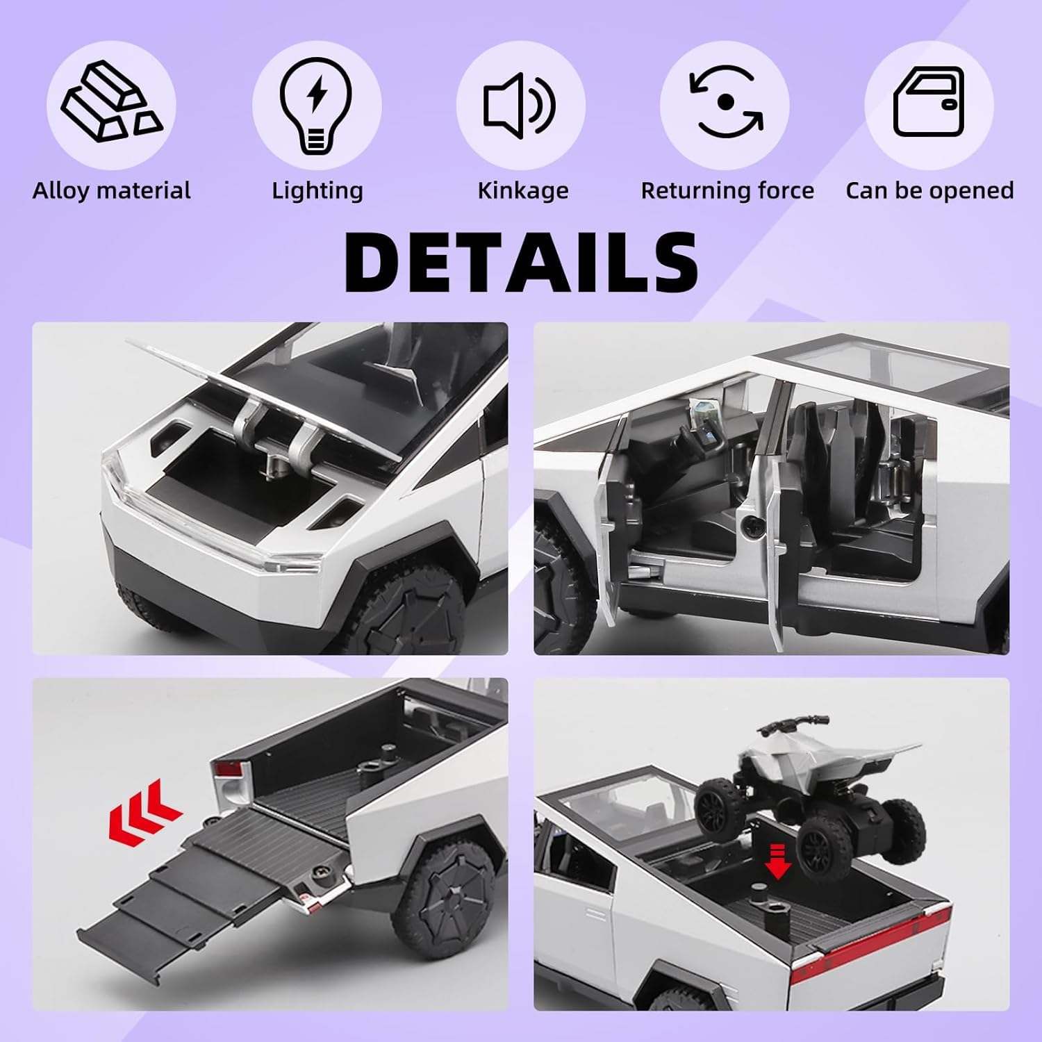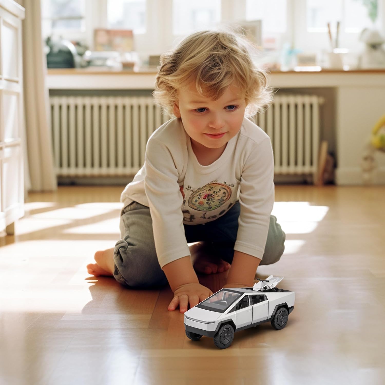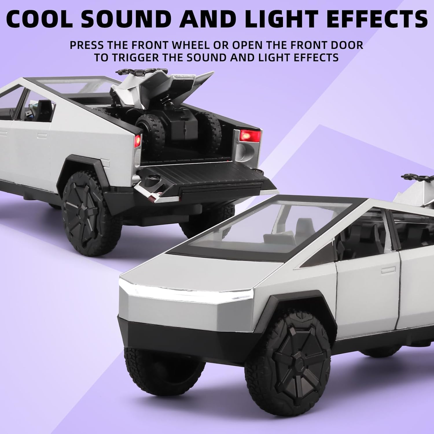 KIDSNEY?? Scale Exclusive Alloy Metal Pull Back Die-cast Car Model with Sound Light Mini Auto Toy for Kids Metal Model Toy Car with Sound and Light (1.32 Scale Tesla CYBERTRUCK-Silver)