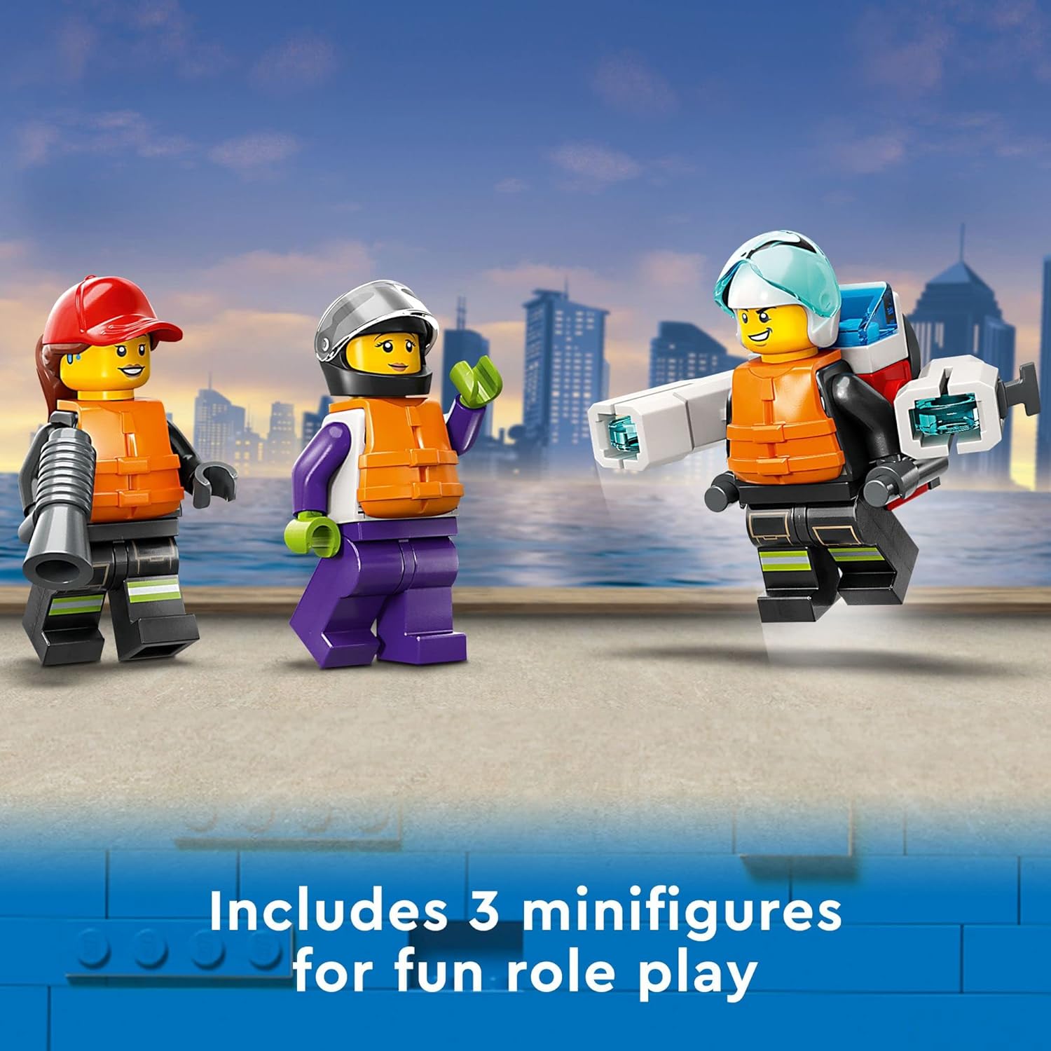 What?s in the box? ? Everything kids need to build a toy firefighter boat and speedboat dinghy, plus 4 minifigures with fun accessories, including a firefighting jetpack