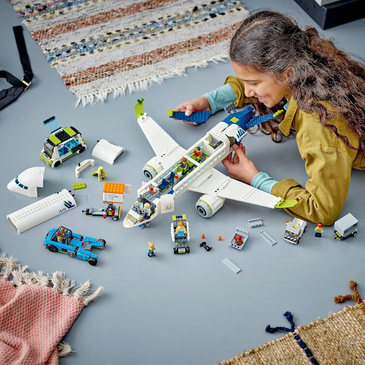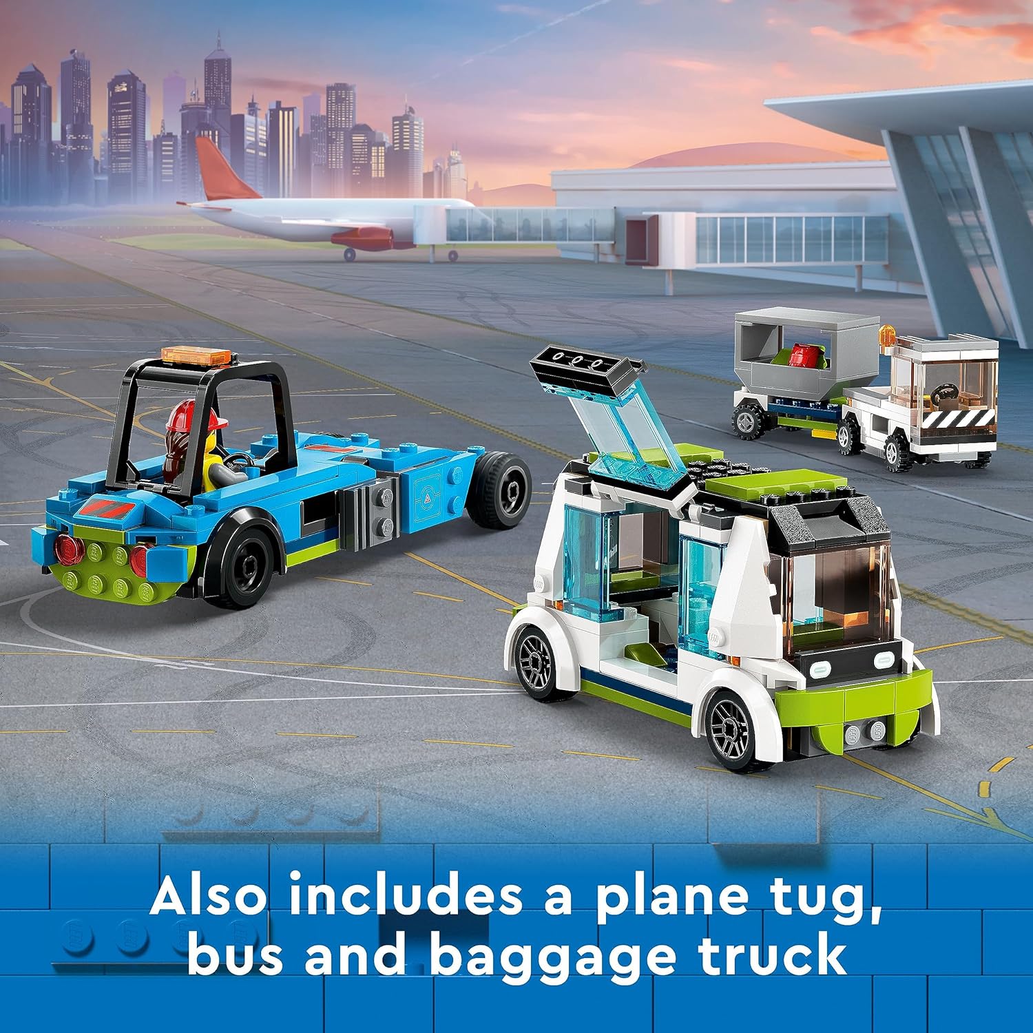 What?s in the box? ? This toy playset has everything kids need to build a Passenger Airplane, airstair, apron bus, pushback tug, catering truck and baggage truck, plus 9 minifigures