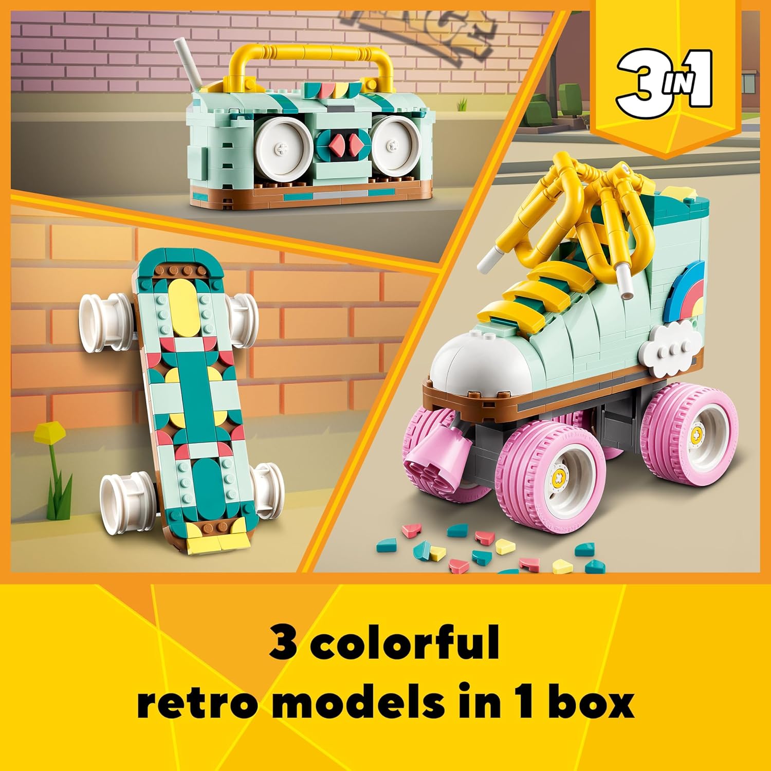 3 retro models in 1 box ? Boys and girls aged 8+ can build and rebuild 3 different pop culture icons using the same bricks with this LEGO Creator Retro Roller Skate toy