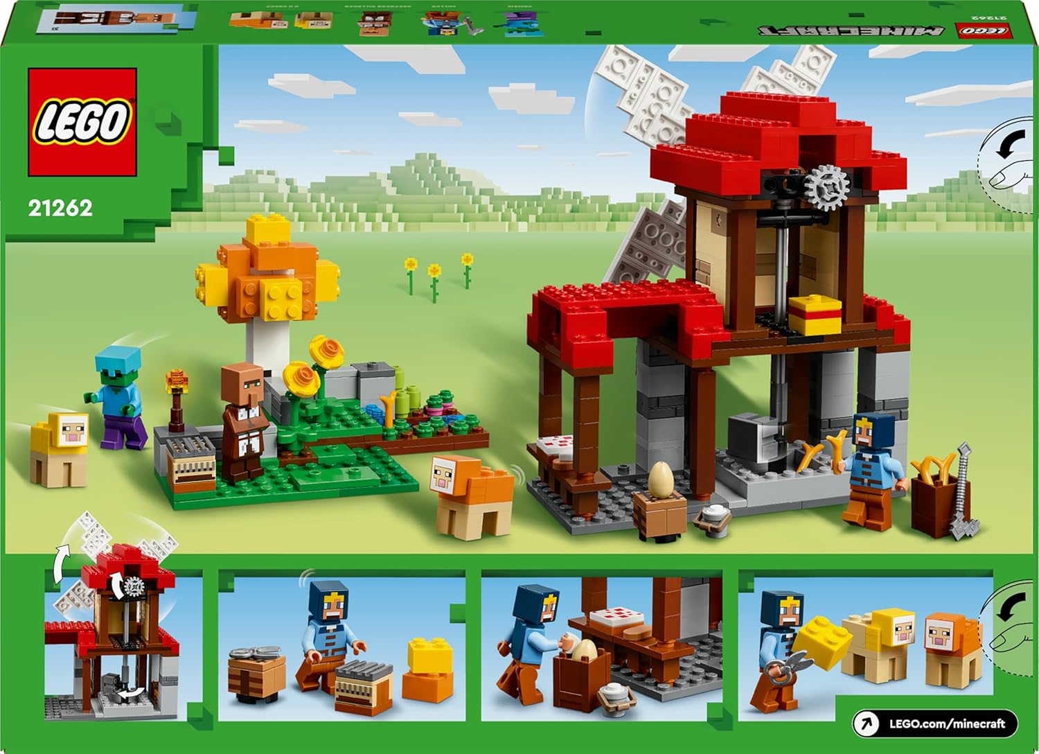 Video-game building playset ? The toy includes a buildable windmill and farm model, plus 2 LEGO Minecraft sheep, a zombie and Miller and Shepherd Villager figures