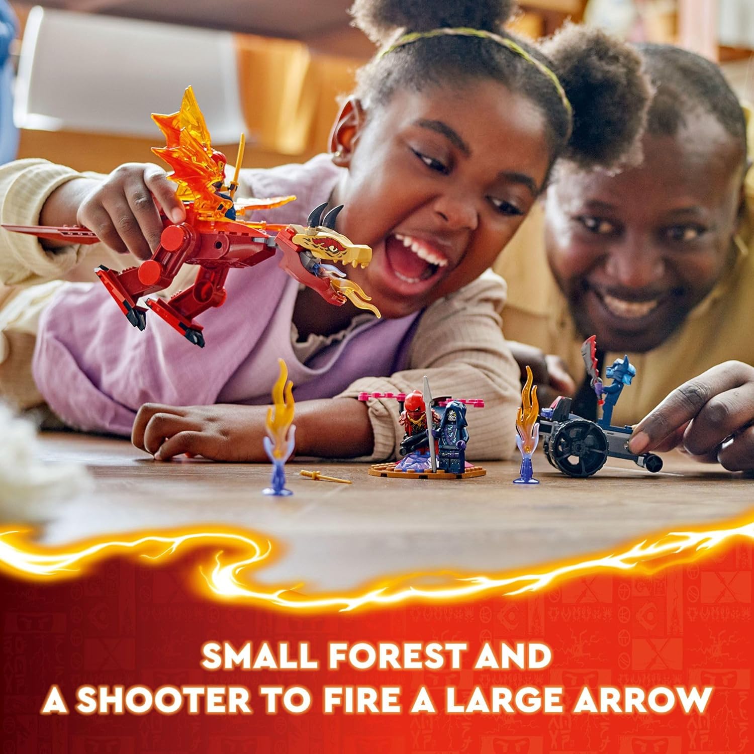 Forest trap and shooter ? This red dragon toy set includes a small forest build used to trap characters, a powerful shooter vehicle that can fire a large arrow, plus 3 small flame elements