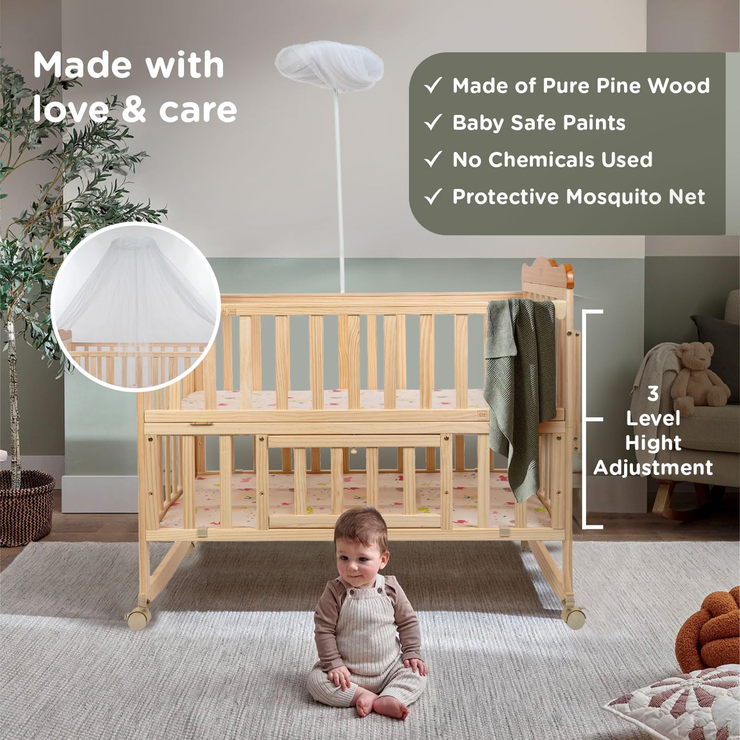 • High-Quality Construction: Made from solid, sustainably-sourced wood, this baby cot is built to last, providing a sturdy and safe space for your baby to sleep and grow.