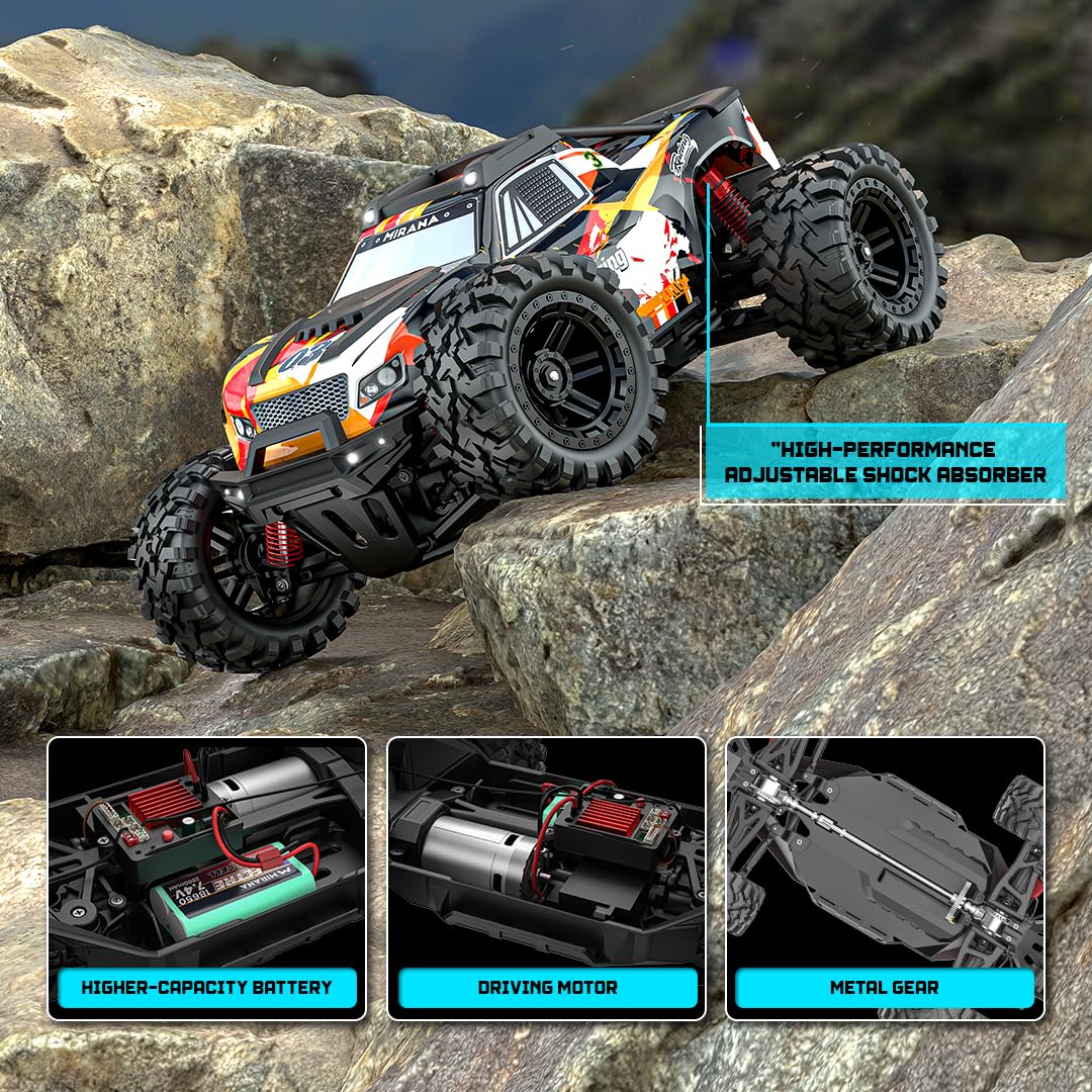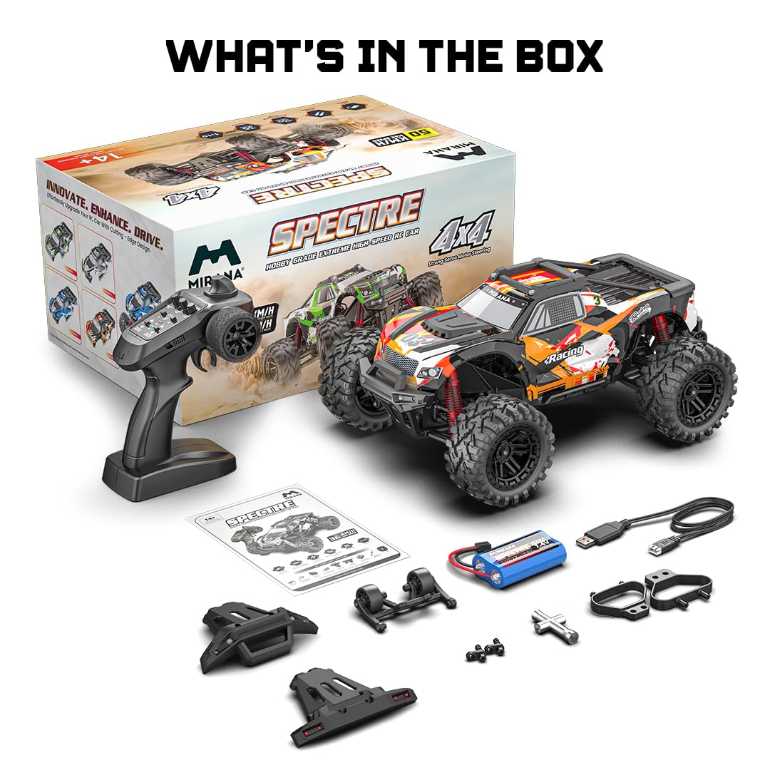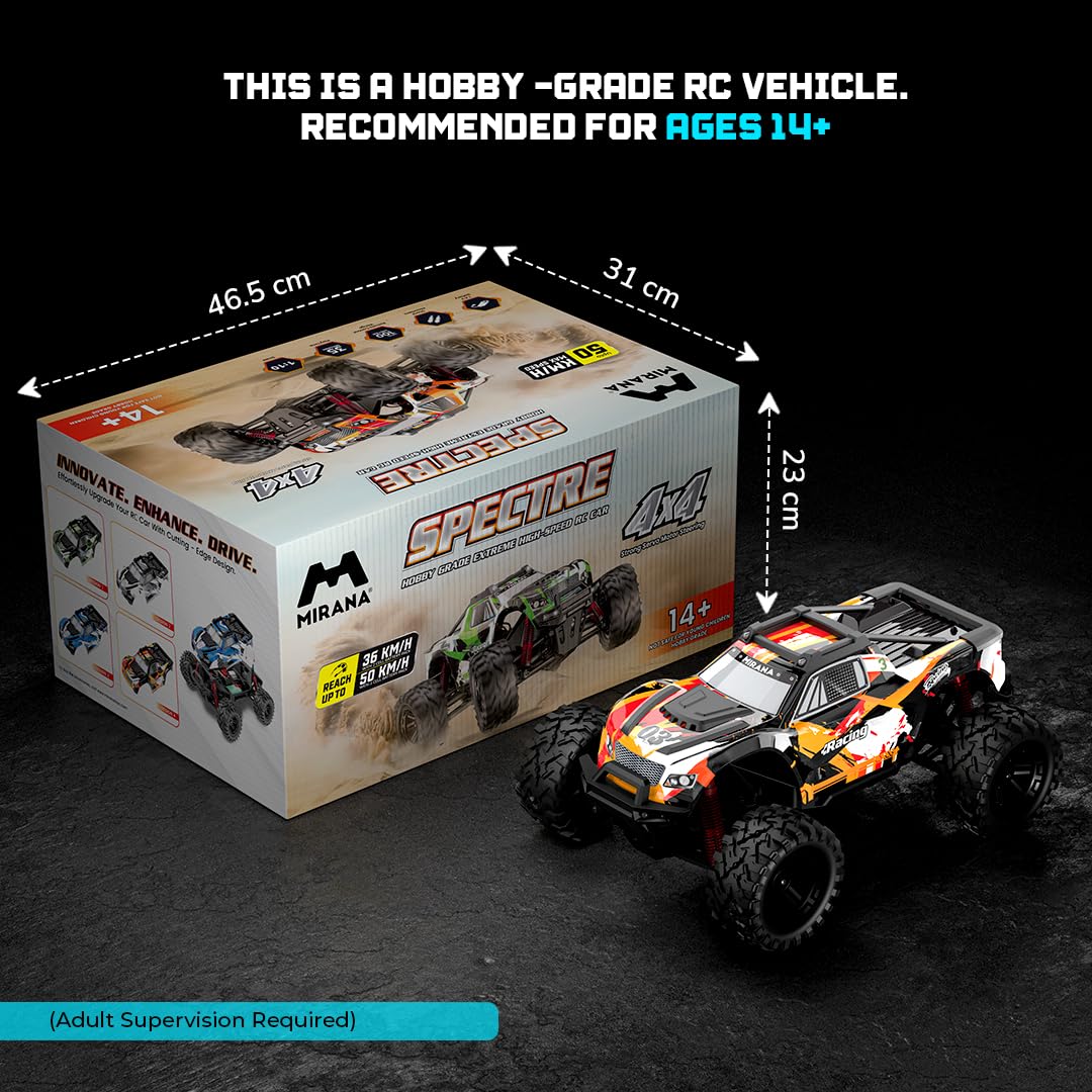 Mirana Spectre 1:10 High Speed Hobby Grade RC Car Toy for Kids & Adults up to 50 kmph – 4×4 Remote Control Offroad Monster Truck ATV – 2 & 3 Pack Rechargeable Batteries – for Ages 14+ Years (Orange)