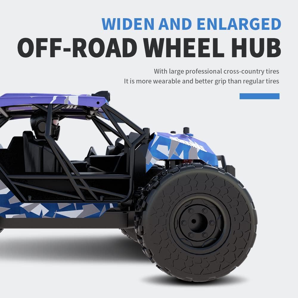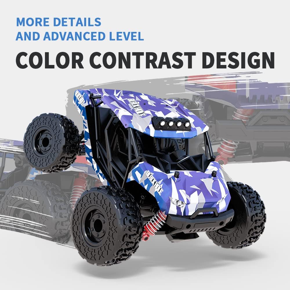 • 【Front Spotlights with Two Explorer Designs】 2023 new design 1:16 rc car has a larger body size, within two luminous LED spotlights are added on the roof, and two little guys are added inside the car, compared with traditional off-road toy vehicles, will have more texture, making you or your children feel like you are controlling the vehicle to explore the world.