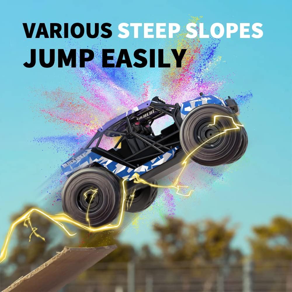 • 【Equipped with 2 Ultra-long Life Battery】Using 7.4V 1200MAh rechargeable lithium battery, which can burst into strong power, and the battery life is up to 25 minutes. In order to reduce your concerns, we have equipped two such batteries. And the battery compartment is designed on the chassis, the battery can be replaced without removing the truck case. What‘s more our car electronic system has overheating protection, anti-jamming protection and low battery voltage cut-off function.