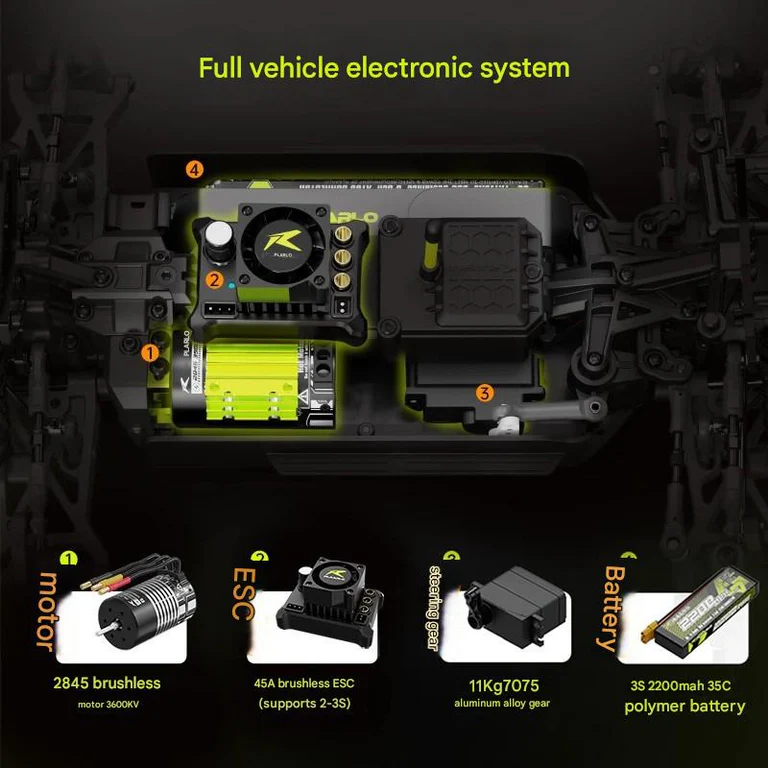 - Equipped with a 45A waterproof brushless ESC featuring a built-in cooling fan and heat sink for maximum efficiency and long-lasting performance. An 11KG waterproof metal gear servo built with 7075 aluminum alloy gears delivers exceptional torque and reliability in all conditions.