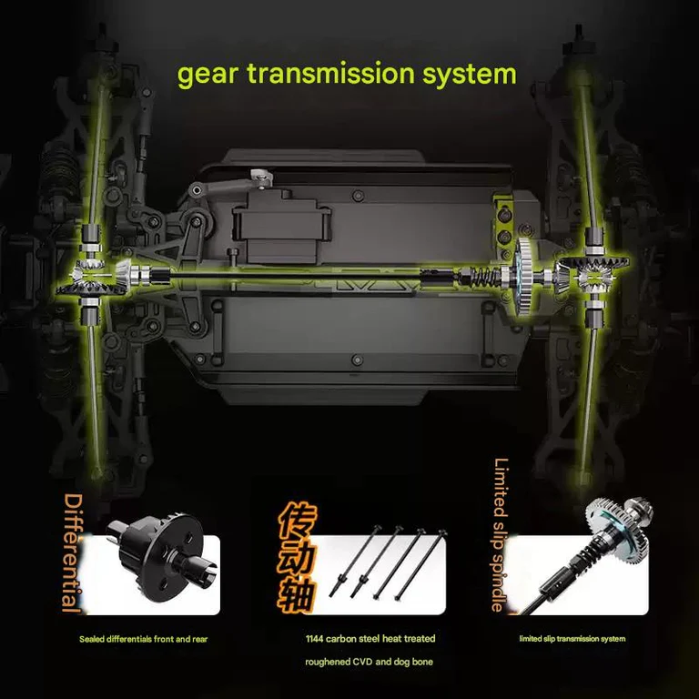 - Front and rear sealed metal gear differentials ensure smooth cornering, improved durability, and consistent performance under stress. The limited-slip design reduces wear and protects electronics during high-speed runs.