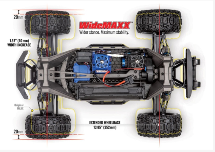The extended chassis length now accommodates our most powerful batteries, the same 6700mAh 4-cell LiPo batteries used in the X-Maxx.