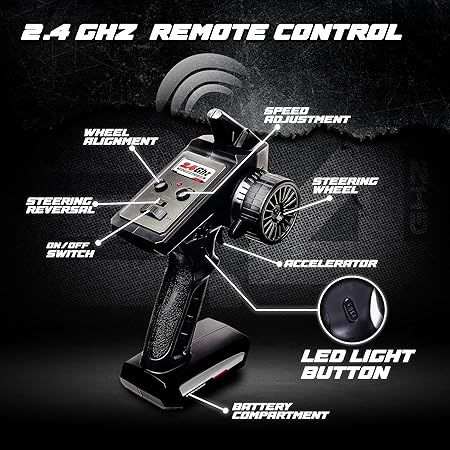 Durable design that is splashproof and equipped with adjustable suspension and shock absorbers, all-terrain tires, and a long range transmitter and rechargable battery pack, it can handle off-road use and has a long run time( 20min) . Additionally, it comes with 2.4GHz radio control for responsive and stable steering, making it suitable for all skill levels.