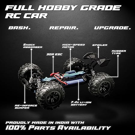 The RC car is equipped with a high-performance 4-wheel drive system, powerful carbon brushed motor, and lithium-ion battery, allowing for maximum speed of 45 km/h, responsive and stable steering, smooth handling, and great off-road capabilities. Suitable for professional level hobbyists, ages 8 and up.